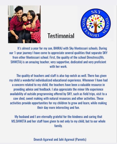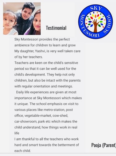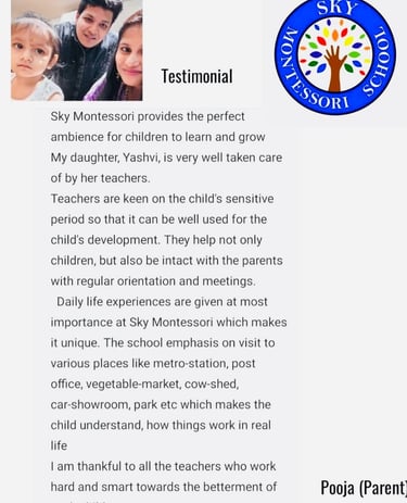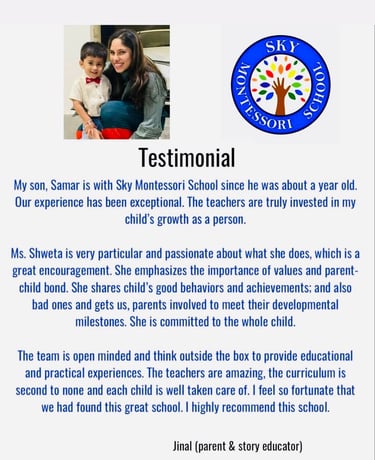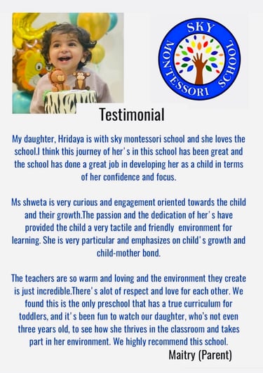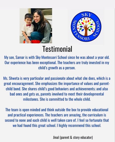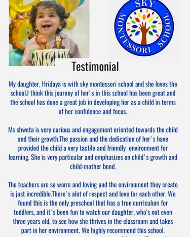 Sky Montessori provides a thoughtful and engaging learning environment, where children are encouraged to explore and develop at their own pace. The dedicated teachers focus on building both academic skills and personal growth, creating a well-rounded educational experience.